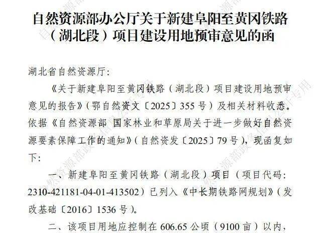 自然资源部办公厅近日印发《关于新建阜阳至黄冈铁路(湖北段)项目建设用地预审意见的函》(自然资办函〔2025〕2263号),标志着该高铁项目建设用地预审获自然资源部批复,为项目全面开工建设奠定了基础。